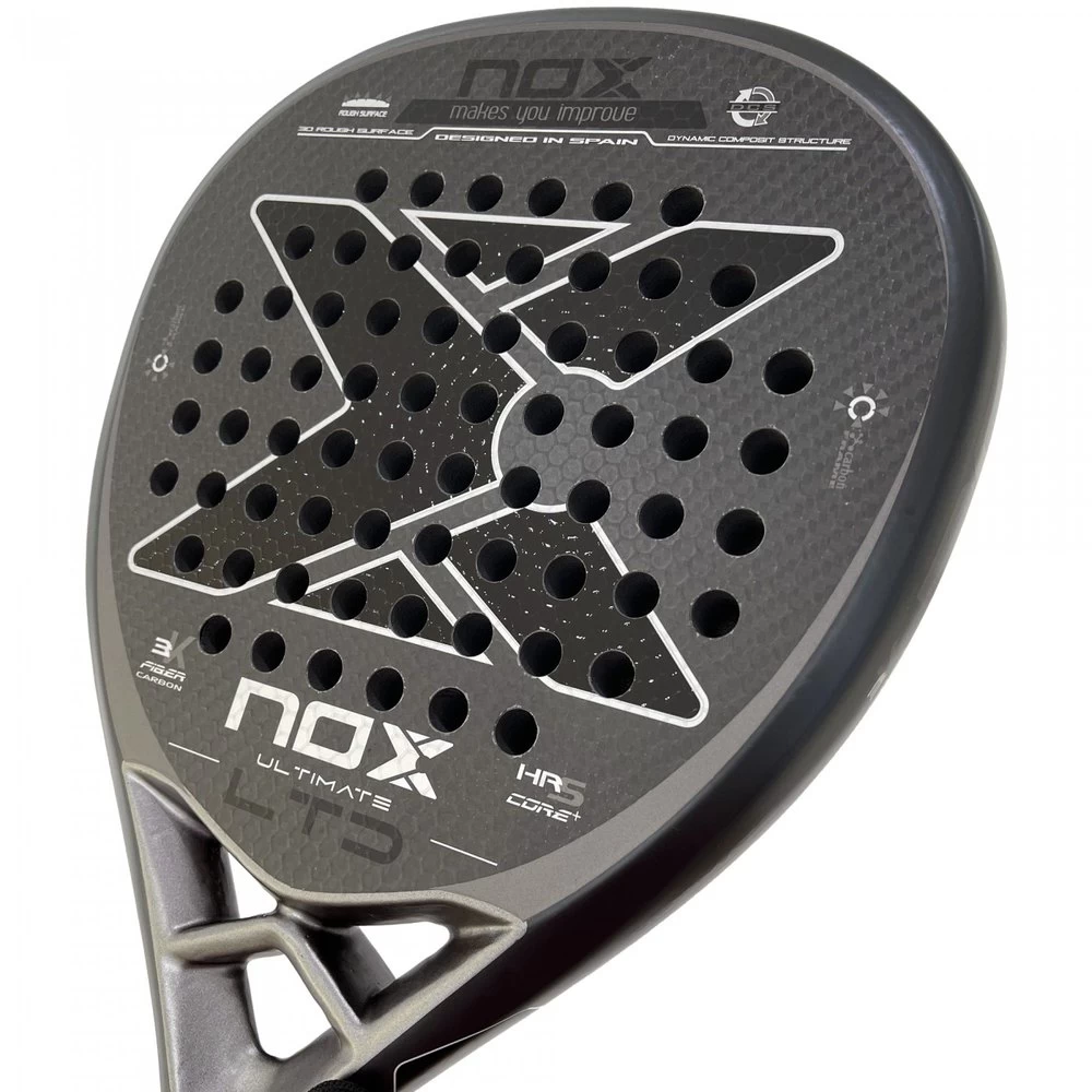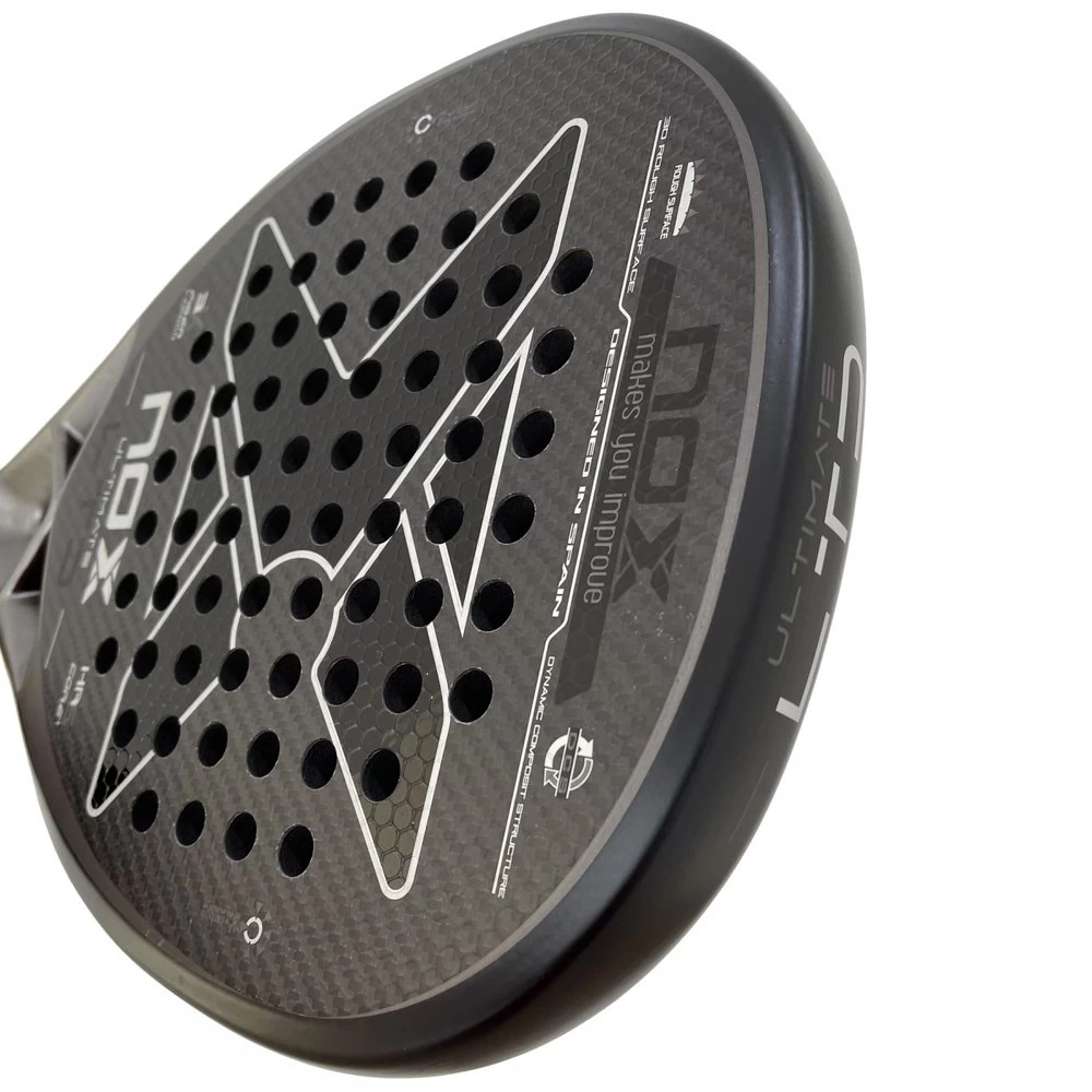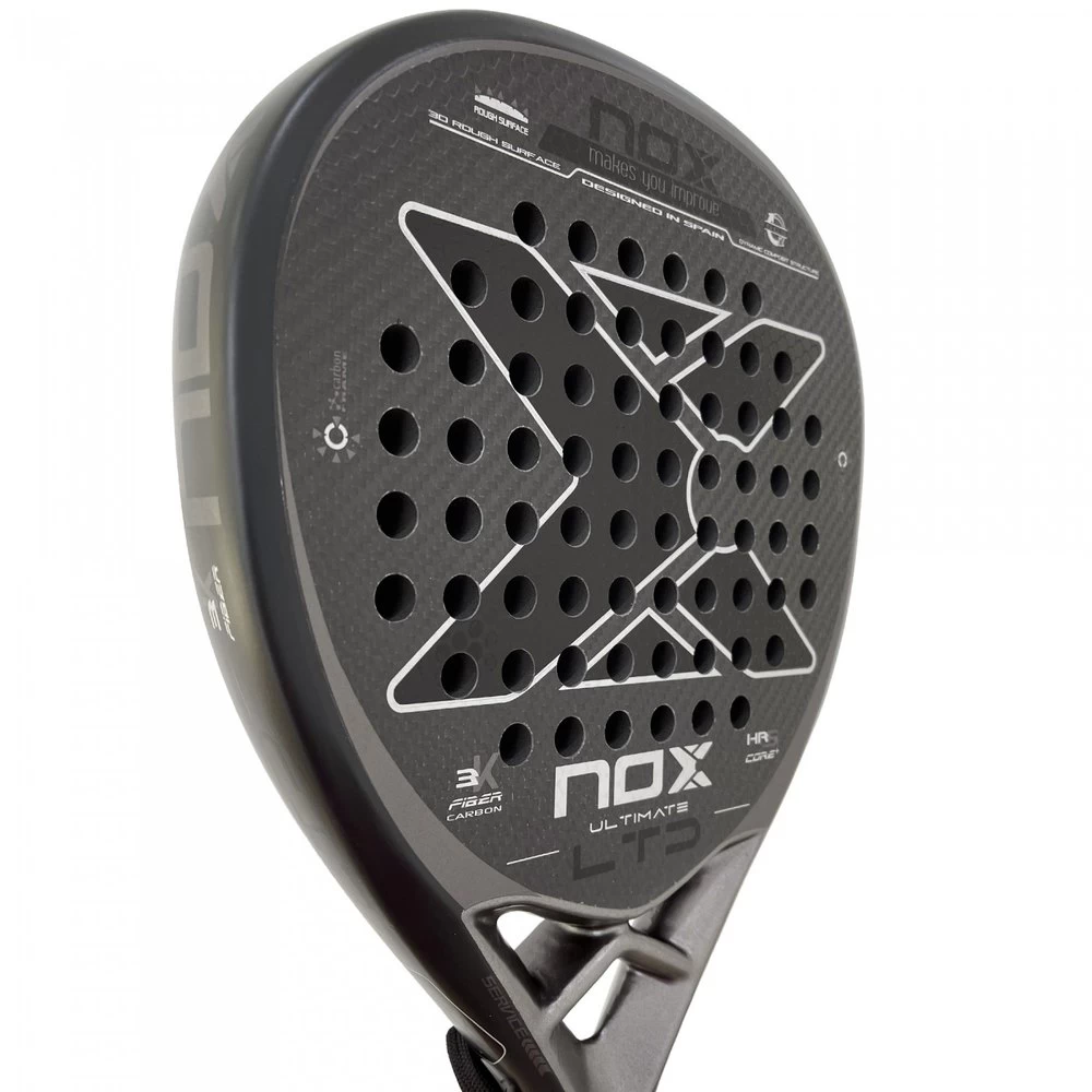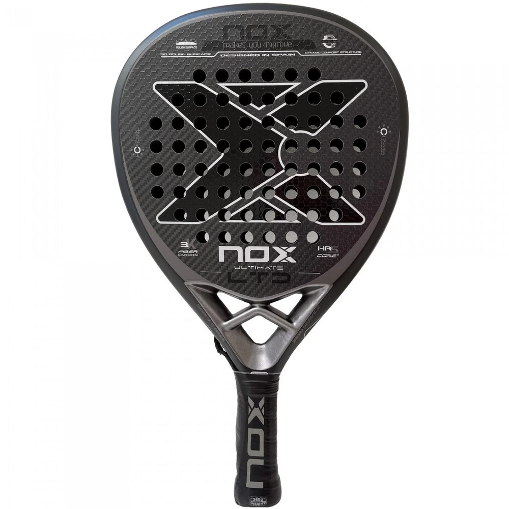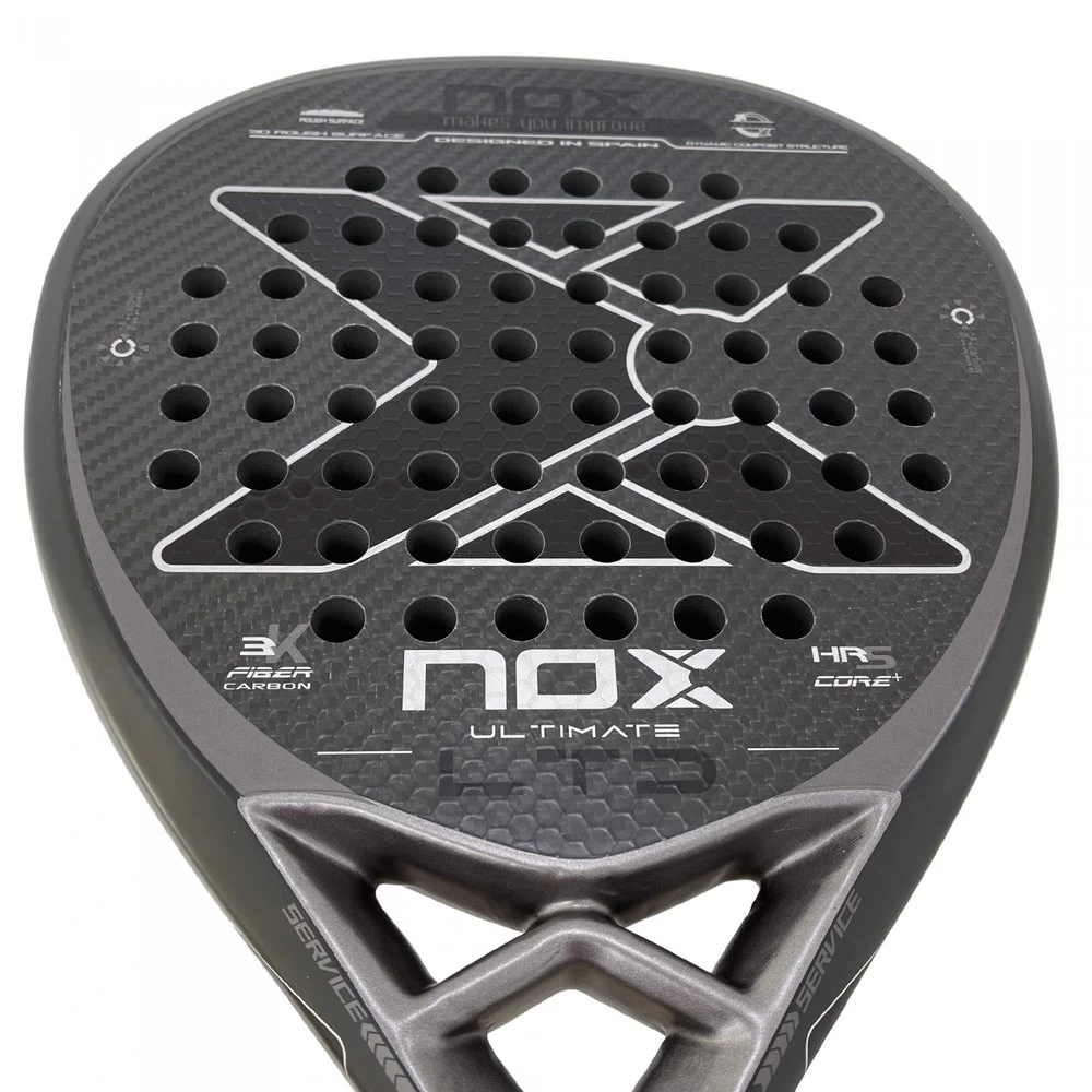 Impressive Nox Ultimate Power Carbon LTD racket made of 100% visible carbon, diamond shape along with HRS CORE+ rubber that increases the speed of recovery, achieving greater power in the hit. Perfect for any level of play thanks to its large mold that prevents vibrations and a wide sweet spot. Rough surface with relief for a greater ball effect when hitting.