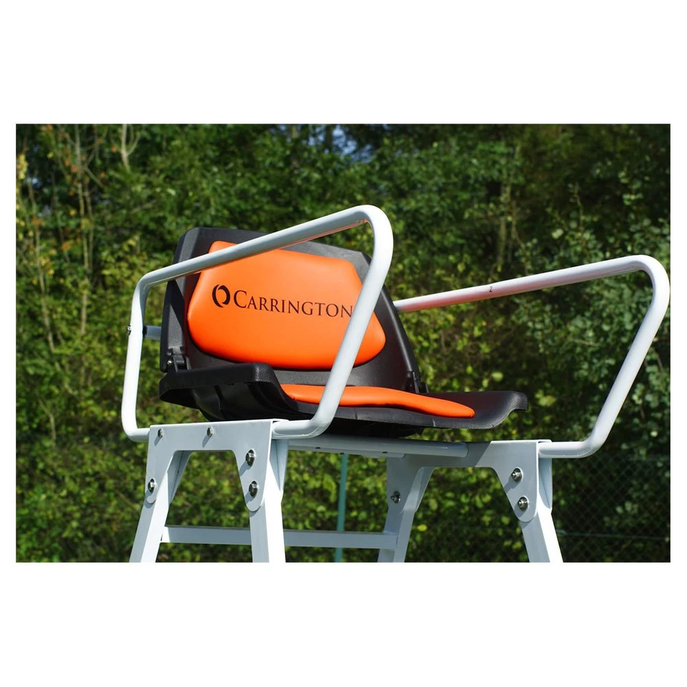 This aluminum umpires chair with European Seal of Approval DiN EN 131, meets the highest of standards. The ladder, with its especially wide slip-proof ranks, alongside the projecting supports with four base plates, give this chair optimum stability. The middle plate between ladder and the supports provides extra durability. The seat mount also has an extra crossbar behind the white, UV-resistant body-contoured seat.